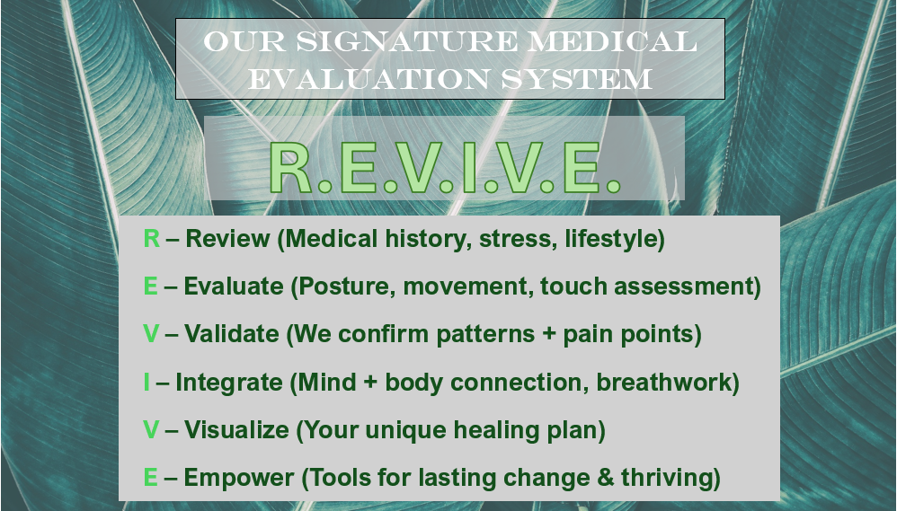 60 min = 50 min body work 5 min REVIVE EVAL 5 min THRIVE aftercare