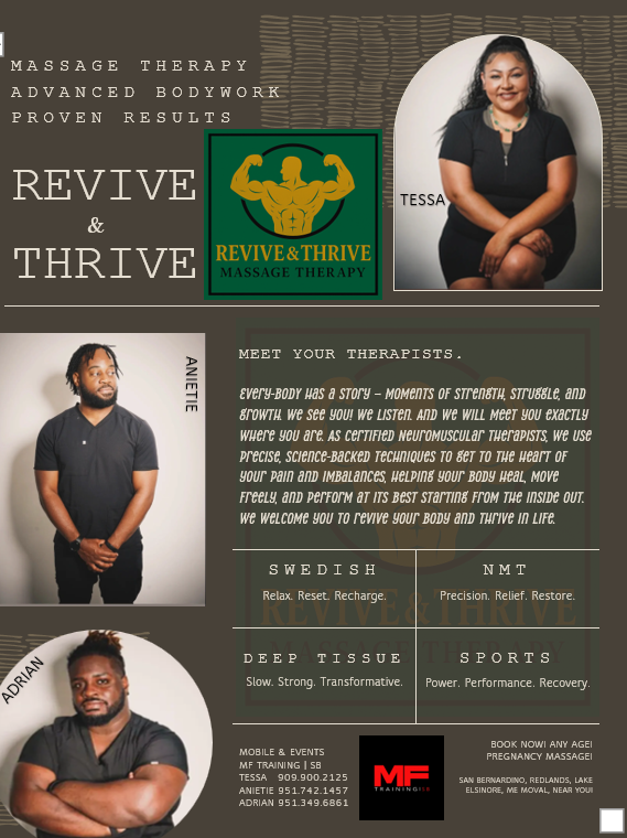 Everybody has a story, and so do we. At Revive & Thrive, we’re more than massage therapists — we’re listeners, educators, and partners in your healing journey. Each session begins with understanding where you’ve been, meeting you where you are, and helping guide you toward where you want to be. Our hands, training, and hearts are dedicated to creating a safe space for recovery, growth, and true transformation. Because when you revive your body, you thrive in life.